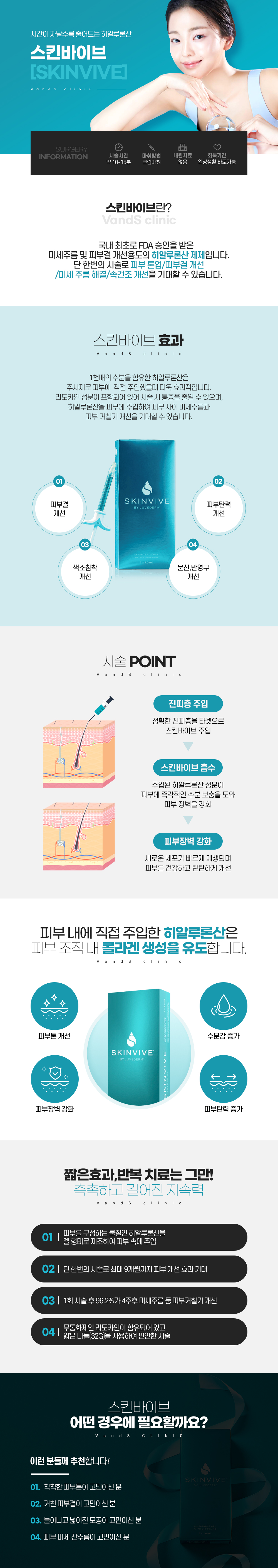 스킨바이브는 국내 최초로 FDA 승인을 받은 미세주름 및 피부결 개선용도의 히알루론산 제제입니다. 단 한번의 시술로 피부 톤업,피부결 개선,미세 주름 해결,속건조 개선을 기대할 수 있습니다.